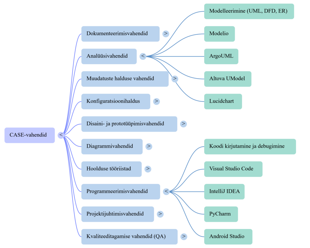 • „ülemise taseme” CASE-vahendid (upper CASE tools) toetavad analüüsi ja projekteerimist. Peamiselt on nad kasutusel kasutajanõuete analüüsimisel ja dokumenteerimisel. Nad on ennekõike mõeldud visualiseerimiseks, erinevate skeemide koostamiseks ja ka dokumentatsiooni genereerimiseks. nad toetavad traditsiooniliste diagrammikeelte kasutamist (olem-seos diagrammid, andmemudelid, UML-skeemid, jne).