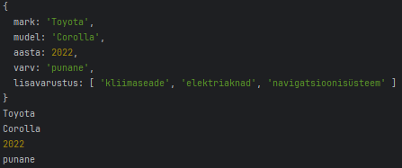 { mark: 'Toyota', mudel: 'Corolla', aasta: 2007 },