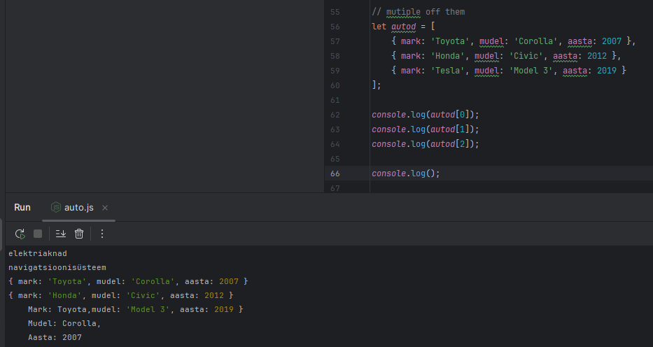 Objektide massiivi loomine on suhteliselt lihtne. Alustame näiteks autode andmete salvestamisega. Iga auto on esindatud objektina, mis sisaldab teavet auto margi, mudeli ja tootmisaasta kohta.