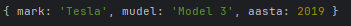 { mark: 'Tesla', mudel: 'Model 3', aasta: 2019 }