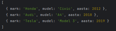 { mark: 'Tesla', mudel: 'Model 3', aasta: 2019 },