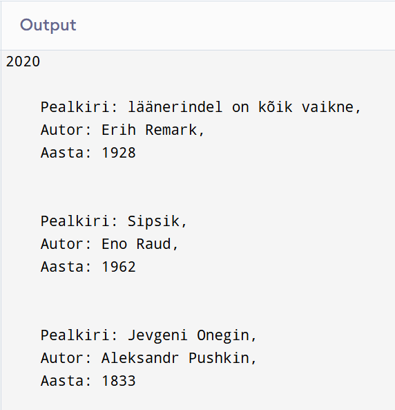 { pealkiri: 'Jevgeni Onegin', autor: 'Aleksandr Pushkin', aasta: 1833}