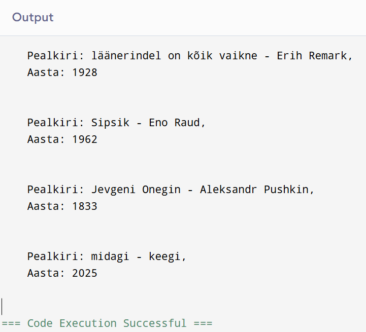 { pealkiri: 'Sipsik', autor: 'Eno Raud', aasta: 1962},
