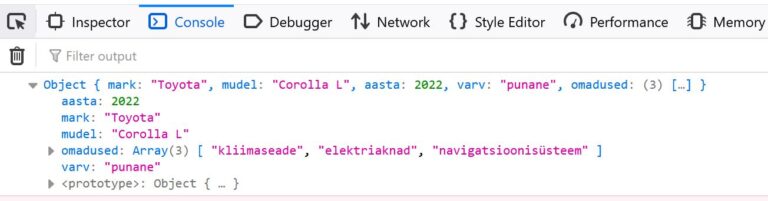 Objekti süntaks koosneb võtme-väärtuse paari paaridest, kus võti on sõne ja väärtus võib olla mis tahes Javascripti andmetüüp. Selles näites on loodud objekt nimega “auto”, millel on järgmised omadused (properties):