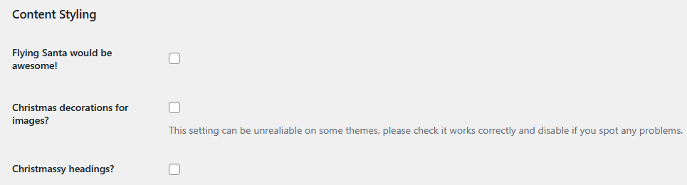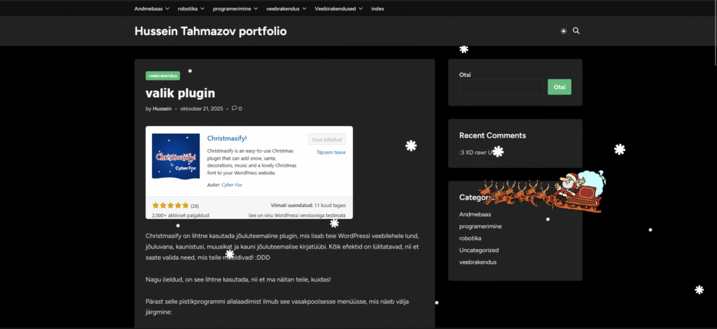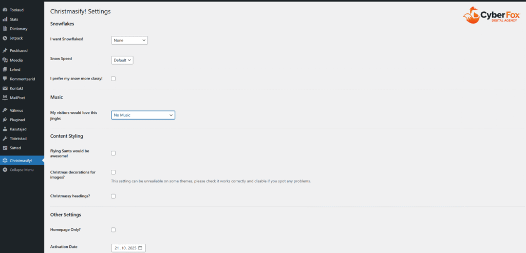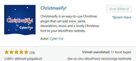 Christmasify on lihtne kasutada jõuluteemaline plugin, mis lisab teie WordPressi veebilehele lund, jõuluvana, kaunistusi, muusikat ja kauni jõuluteemalise kirjatüübi. Kõik efektid on lülitatavad, nii et saate valida need, mis teile meeldivad! :DDD