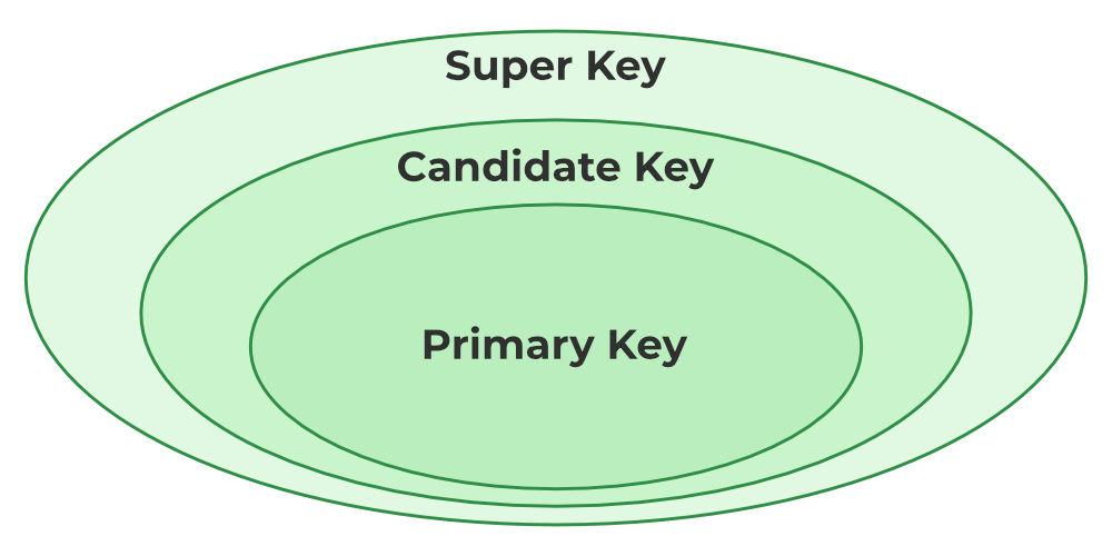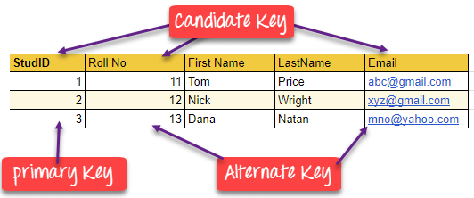 SUPER KEY – Ühe või mitme atribuudi (veeru) kogum, mis võimaldab tuplit (kirjet) üheselt identifitseerida, on tuntud kui supervõti. See võib sisaldada lisatunnuseid, mis ei ole unikaalsuse seisukohalt olulised, kuid mis siiski identifitseerivad rea üheselt. Näiteks STUD_NO, (STUD_NO, STUD_NAME) jne.