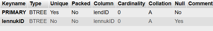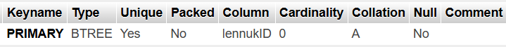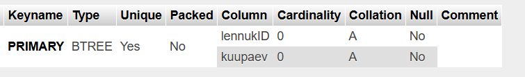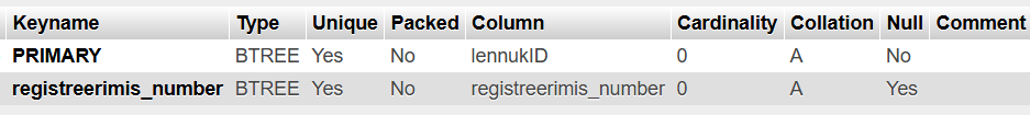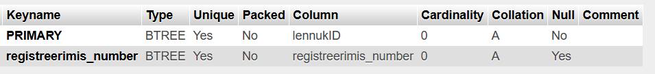 Siin on veeru id märgitud UNI-võtmega, mis näitab, et tegemist on unikaalse võtmega. Lisaks näeme veeru Null all märget YES, mis tähendab, et veerg id võib sisaldada NULL-väärtusi.